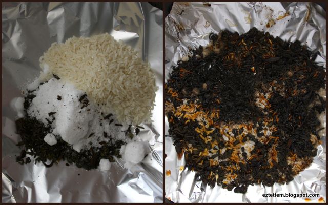 - a wokba tettem 2 réteg alufóliát, amire rászórtam a só-rizs-tea-vanília keveréket. ezt lefedtem újabb 2 réteg alufóliával.
