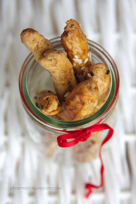 az összes hozzávalóból rugalmas, az edény falától elváló tésztát kellett volna gyúrnom - ami nem sikerült. egyáltalán nem viselkedett normális kelt tésztaként. sőt! az előírt idő leteltével sem kelt meg. de én mindezt Buddhához hasonlatos nyugalommal vettem tudomásul. a meg nem kelt tésztából 11 kb. golyót csináltam, amiket egy nedves papírtörlővel letakartam és hagytam még egy kicsit kelni tovább állni. majd megpróbáltam grissinivé sodorni a golyókat. teljes kudarc. de továbbra sem hagytam felborzolni az idegeimet - ott lebegett előttem a kép, amit meg akartam csinálni a csudálatos, frissen sült, házi ropijaimról. tehát a módszer: a két mutató- és hüvelykujj segítségével addig nyomkodtam a levegőben, amíg pálca nem lett, aztán még hengerítettem egyet rajtuk és elengedtem a 20 cm-es grissinik képét. de 12 centisre simán ki tudtam nyomkodni. egy felvert tojással átkentem őket, hogy ragadjon rájuk a szezámmag/feketehagyma-mag/só.